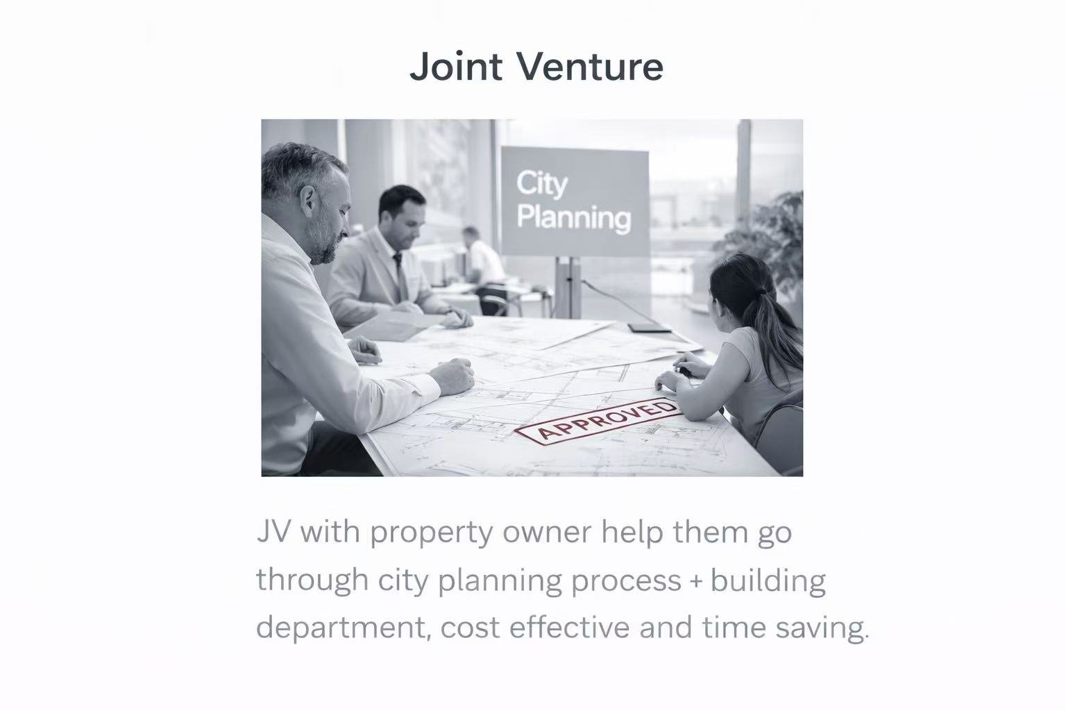 We partner with property owners through joint ventures to navigate city planning and building department approvals.
